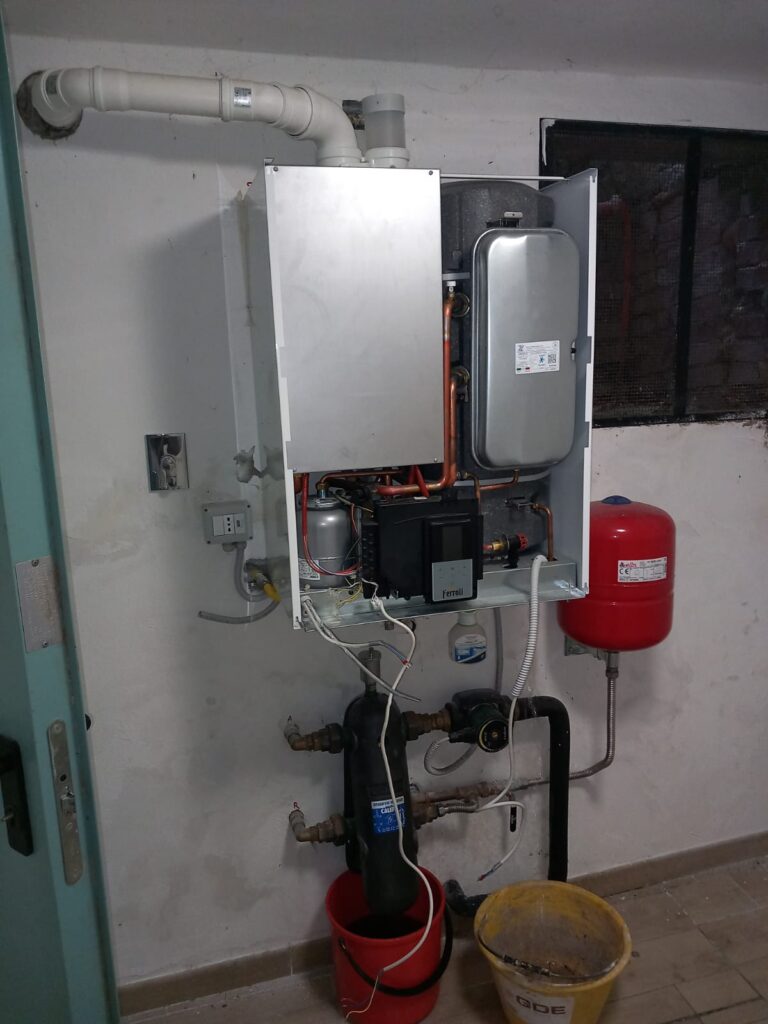 L’impianto di distribuzione è a radiatori per cui la pompa di calore in questo caso lavora in climatica tra i 45 ed i 52 °C.